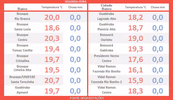 Dando continuidade à matéria, vamos abordar agora o monitoramento do tempo observado na região de Brusque durante a madrugada desta segunda-feira, com dados obtidos pela rede Groh Estações.