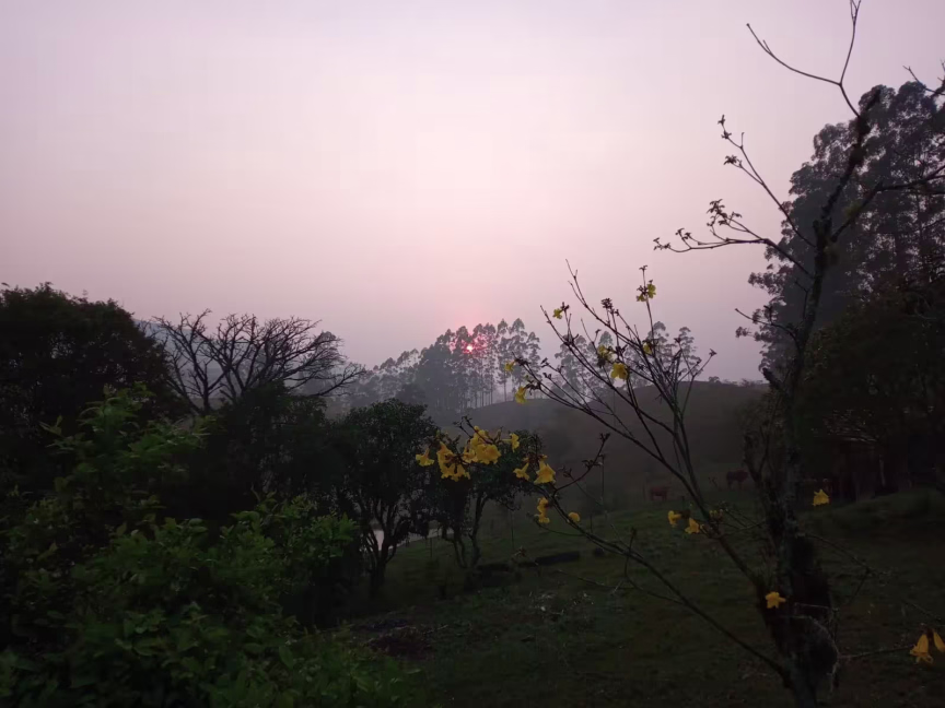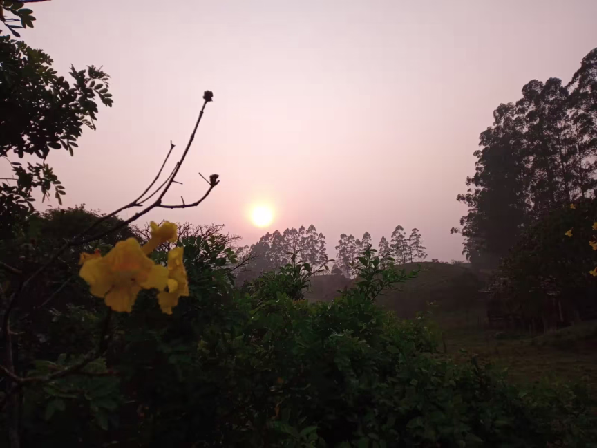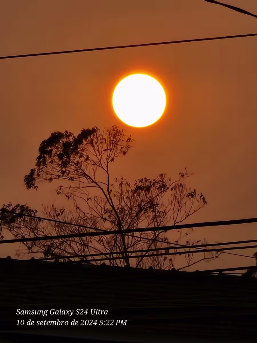 A fumaça conferirá ao sol uma tonalidade avermelhada, criando um visual distinto e deixando o horizonte parcialmente encoberto.
