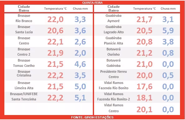A tabela anexa apresenta as temperaturas mínimas registradas logo após o amanhecer em diversos pontos no Vale do Itajaí-Mirim.