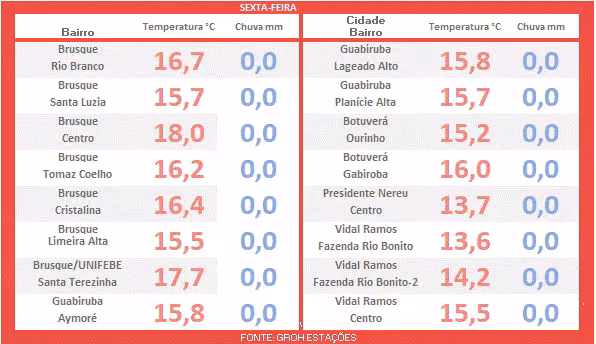 A tabela abaixo traz as temperaturas mínimas registradas em cada local, destacadas em vermelho.