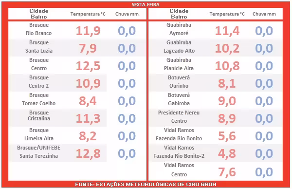 A tabela abaixo então apresenta as temperaturas mínimas registradas logo após o romper da aurora desta sexta-feira, ilustradas em vermelho.