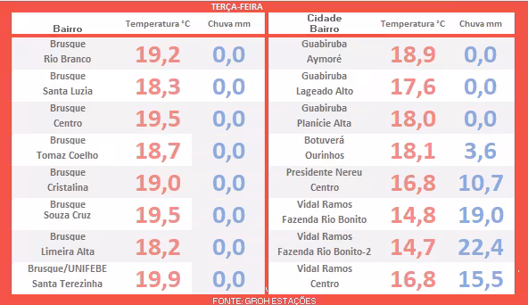 Portanto, este é o quadro climático atual esperado para Brusque e região nesta terça-feira.