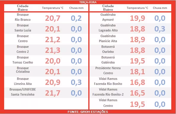 Dando continuidade à matéria, o foco agora é o monitoramento das condições climáticas observadas durante a madrugada desta terça-feira em todo o Vale do Itajaí-Mirim, realizado em parceria com a rede Groh Estações.