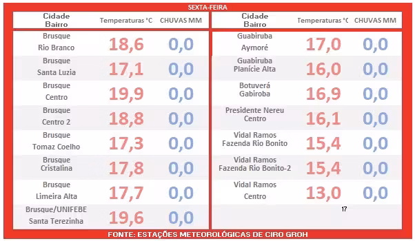 A tabela abaixo então apresenta as temperaturas mínimas registradas logo após o romper da aurora desta sexta-feira, ilustradas em vermelho.