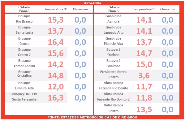 A tabela abaixo então apresenta as temperaturas mínimas registradas logo após o romper da aurora desta sexta-feira, ilustradas em vermelho.