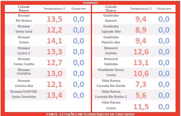 A madrugada de segunda-feira, 21, promete seguir fria, com mínimas próximas dos 10°C ao amanhecer em Brusque e em outras cidades situadas no Vale do Itajaí-Mirim.