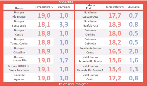 Você pode acompanhar mais adiante os detalhes completos da previsão do tempo, direcionados para toda a região do Vale do Itajaí-Mirim.