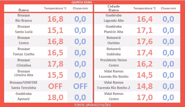 Os moradores de Brusque e região, que planejam atividades externas nesta quinta-feira, 22, ainda podem seguir aproveitando o tempo seco, com temperaturas alcançando máximas próximas de 30°C durante a tarde.