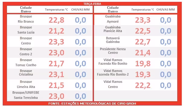 A tabela abaixo então apresenta as temperaturas mínimas registradas logo após o amanhecer desta terça-feira, correspondentes a cada local descrito em anexo na coluna em vermelho.