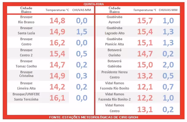 A tabela anexa apresenta as temperaturas mínimas registradas logo após o amanhecer em diversos pontos no Vale do Itajaí-Mirim.
