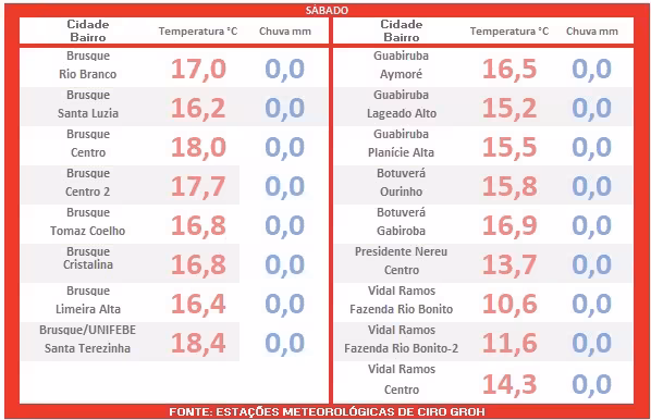 A tabela abaixo então apresenta as temperaturas mínimas registradas logo após o romper da aurora desta sexta-feira, ilustradas em vermelho.