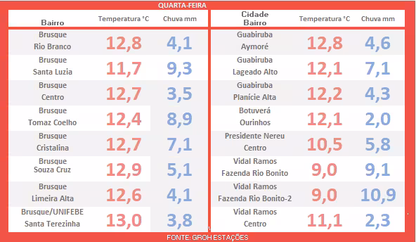 Vale ressaltar que essa estabilidade do tempo dura pouco, até sexta-feira, quando as chuvas devem retornar à noite, trazendo na retaguarda o clima gelado previsto para os dias subsequentes.