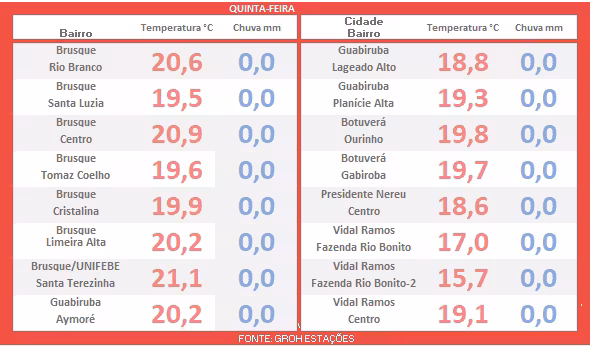 As madrugadas, apesar de frias, não terão temperaturas excessivamente baixas, variando entre 10°C e 13°C em Brusque e cidades vizinhas.