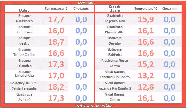 Dando continuidade à edição deste domingo, destacamos agora as informações sobre o monitoramento das condições climáticas observadas na região brusquense durante a madrugada.