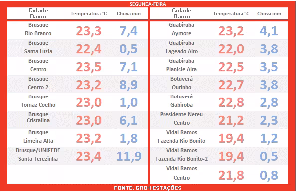 Dando continuidade à nossa matéria, vamos abordar o monitoramento do tempo na região de Brusque, realizado durante a madrugada desta segunda-feira.