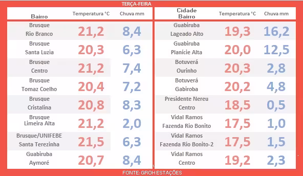 Dando continuidade à matéria, o foco agora é o monitoramento das condições climáticas observadas durante a madrugada desta terça-feira em todo o Vale do Itajaí-Mirim, realizado em parceria com a rede Groh Estações.