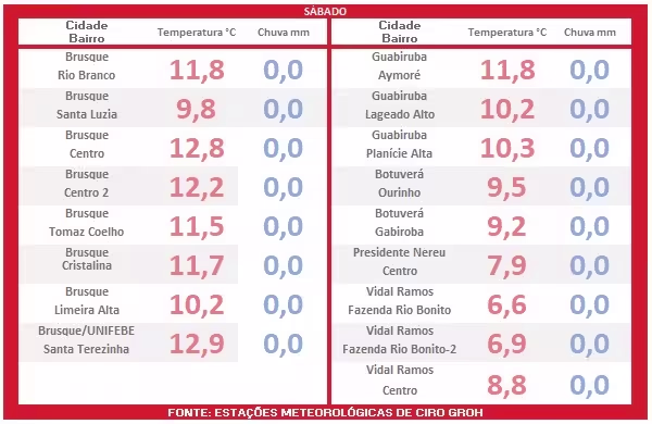 Os termômetros, nas primeiras horas do dia, registraram marcas de 9,8°C no bairro Santa Luzia e 10,2°C no Limeira Alta, respectivamente, configurando assim as menores temperaturas da cidade.