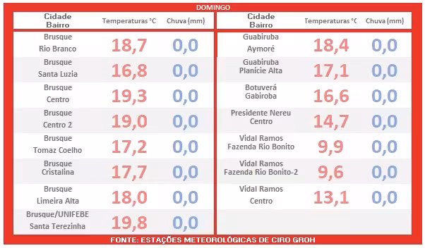 Os moradores de Brusque amanheceram neste domingo, 4, sob um comportamento térmico distinto daquele observado no sábado, 3, quando o calor levou os termômetros da cidade a beirar os 40°C.