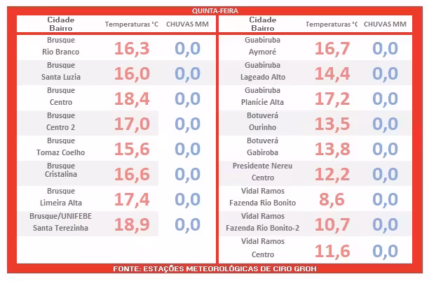 A tabela anexa apresenta as temperaturas mínimas registradas logo após o amanhecer em diversos pontos no Vale do Itajaí-Mirim.