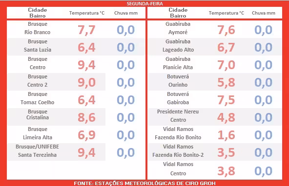 Segundo sua avaliação, embora as noites e madrugadas sigam geladas em todo o Vale do Itajaí-Mirim, as tardes devem apresentar uma discreta elevação nos termômetros.