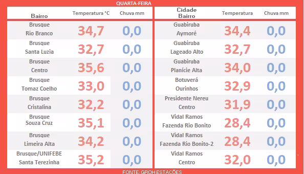 Apresentaremos a seguir o levantamento detalhado da apuração, que inclui os picos máximos de temperatura registrados nesta quarta-feira em todo o Vale do Itajaí-Mirim.