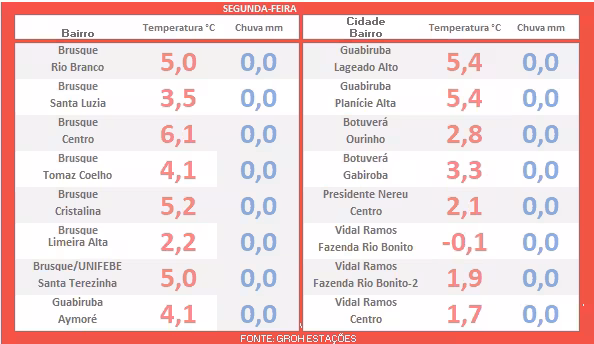 Acompanhe, a seguir, o levantamento completo das temperaturas mínimas registradas em todo o Vale do Itajaí-Mirim, entre a madrugada e o amanhecer desta segunda-feira.
