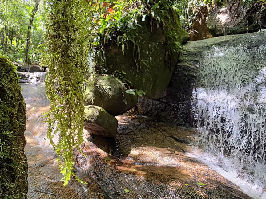 O cenário, cercado pela mata, impressiona pela harmonia e pela atmosfera de isolamento, em que o único som presente é o canto dos pássaros e o fluxo constante da água.