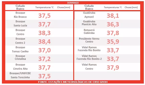 Logo abaixo será apresentada a tabela com as temperaturas máximas registradas neste domingo em Brusque e nas demais cidades do Vale do Itajaí-Mirim.