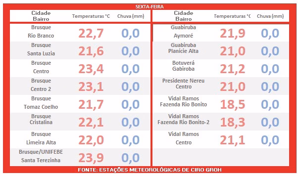 Quanto às temperaturas, os termômetros prometem seguir com máximas acima dos 30 °C, não descartando picos próximos de 35°C entre esta sexta-feira e o domingo em áreas do Vale do Itajaí-Mirim.