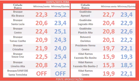 Veja a seguir uma análise comparativa das temperaturas mínimas registradas neste raiar do dia (sexta-feira), e na mesma faixa horária de ontem (quinta-feira).