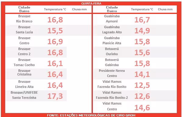 Esse período, usualmente marcado pelo maior aquecimento diário, revela números que inequivocamente sugerem a necessidade de agasalhos para os residentes de todo o Vale do Itajaí-Mirim.