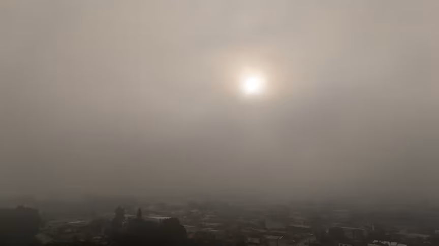 Ainda durante a madrugada, uma espessa camada de neblina começou a se formar sobre a cidade, impulsionada pela combinação entre o ar frio e a completa ausência de ventos.