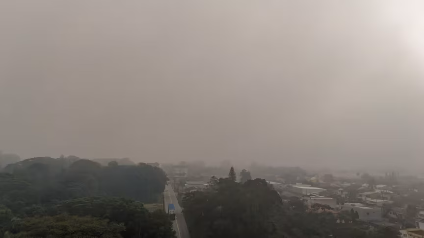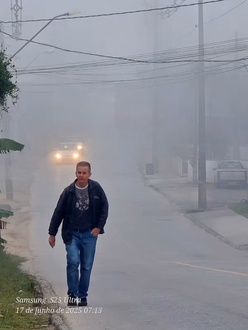 A névoa densa então dificultava a visualização de cruzamentos, sinalizações e veículos em movimento, exigindo cautela em cada deslocamento.