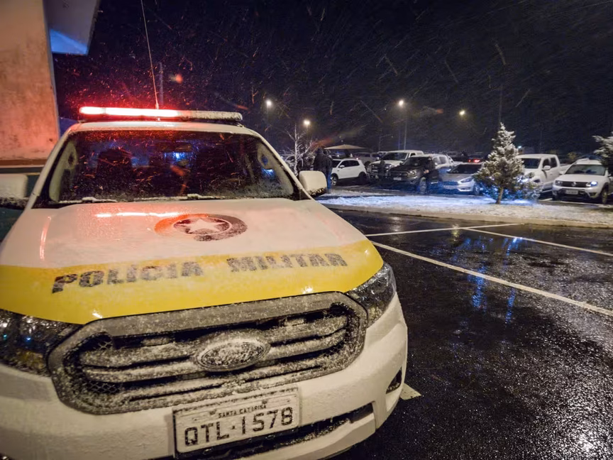 A Polícia Militar Rodoviária (PMRv) também compartilhou fotos da neve na Serra. No Mirante da Serra, localizado na Serra do Rio do Rastro, os termômetros marcaram -2,3°C, de acordo com a polícia.