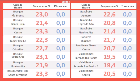 Este sábado prevê um aquecimento que pode ultrapassar os 35° em Brusque e em muitas cidades do Vale do Itajaí. Essa elevação térmica deve se repetir no domingo.