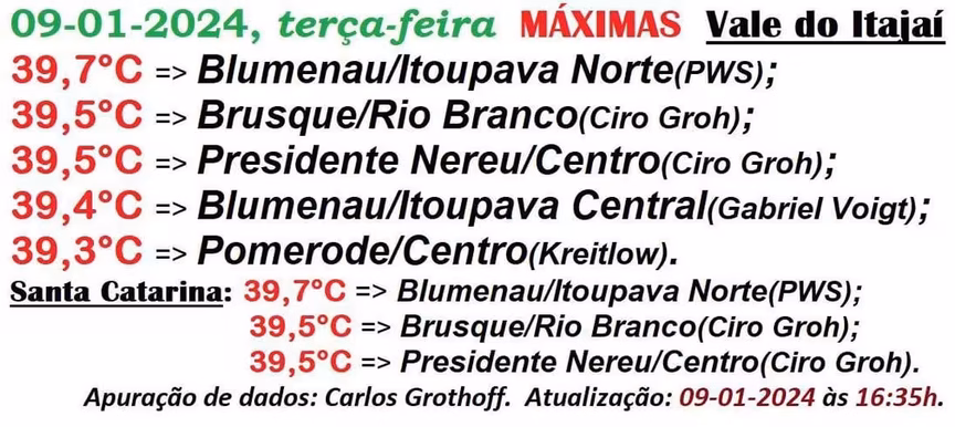 Na continuidade desta edição, apresentamos agora o levantamento abrangente das temperaturas máximas registradas em toda a região do Vale do Itajaí-Mirim.