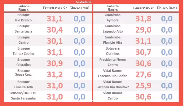 A seguir, vamos apresentar o levantamento das temperaturas máximas desta sexta-feira assinalados por todo o Vale do Itajaí-Mirim. Por meio desses números, torna-se evidente que o calor atípico se fez presente de forma abrangente.