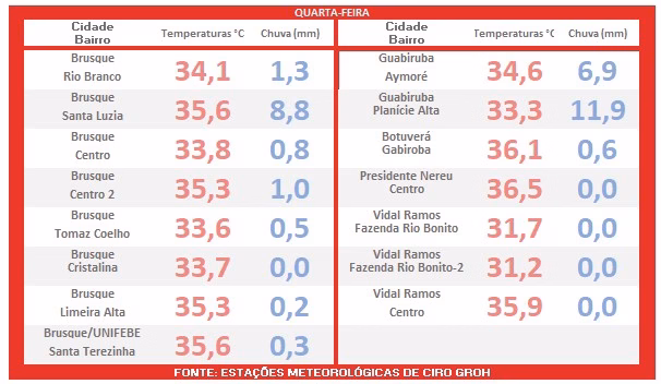 Além do registro visual, a matéria reúne a seguir os dados completos das temperaturas máximas observadas não apenas em Brusque, mas também em municípios monitorados no Vale do Itajaí-Mirim.