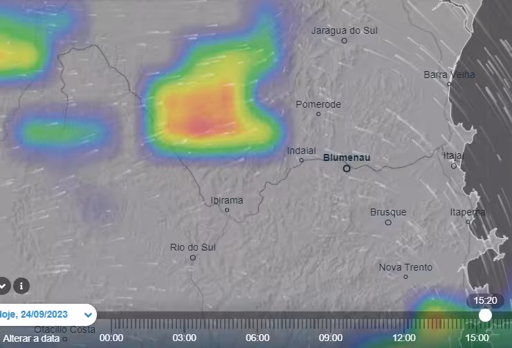 A imagem de radar, atualizada às 15:20 e exibida abaixo, já indicava nesse horário, a formação de núcleos de trovoadas em direção ao vale do Itajaí.