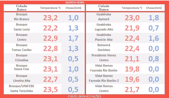O ponto de destaque é a mudança no padrão climático. Embora não estejamos esperando frio, as madrugadas prometem ser amenas, com temperaturas mínimas variando entre 15 e 18 ou 19°C no Vale do Itajaí.