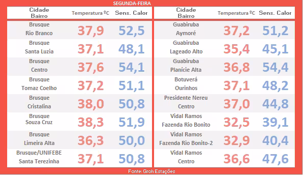 Os dados destacados em vermelho representam os valores convencionais registrados pelos termômetros, enquanto os destacados em azul ilustram a sensação de calor correspondente a cada local mencionado.