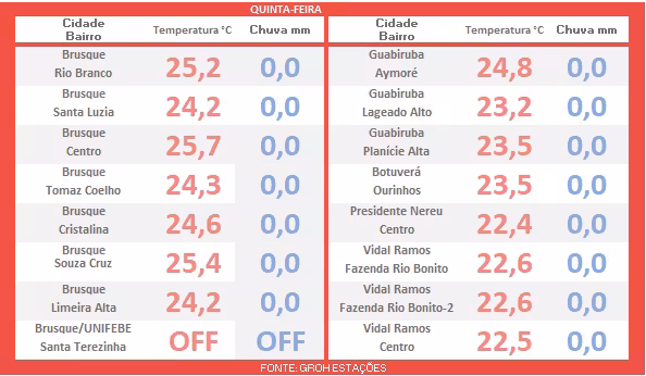 A previsão do tempo para esta quinta-feira anuncia mudanças climáticas radicais para Brusque e todo o Vale do Itajaí, no que se refere aos termômetros.