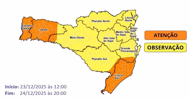 A Defesa Civil de Brusque emitiu um alerta para temporais com chuva intensa entre as tardes de terça-feira, 23, e quarta-feira, 24. O município está em estado de observação.