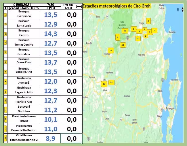 Abaixo estão as temperaturas mínimas deste sábado assinaladas por todo o Vale do Itajaí-Mirim:
