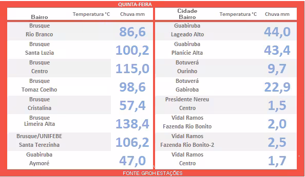 Confira abaixo os volumes parciais de chuva registrados nesta quinta-feira, tanto em Brusque quanto em todo o Vale do Itajaí-Mirim.