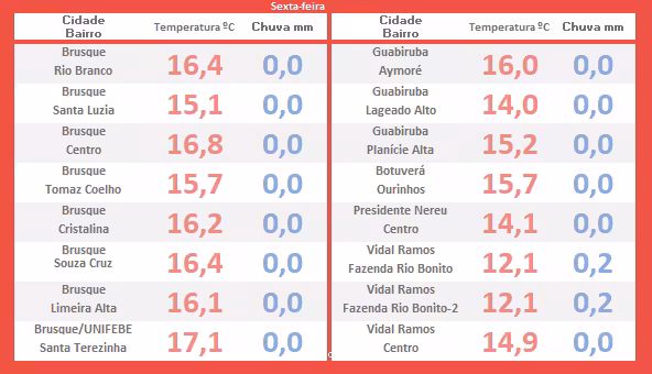 A tabela abaixo apresenta então as temperaturas mínimas registradas imediatamente após o amanhecer desta sexta-feira (destacado em vermelho).