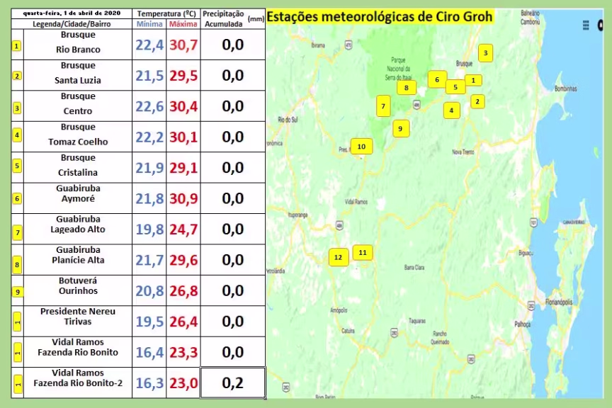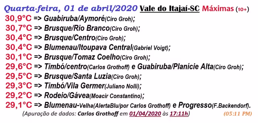 Os termômetros por sua vez, registraram máximas na casa dos 30ºC, com destaque para os 30,9ºC do bairro Aymoré em Guabiruba, que ficou com a temperatura mais alta de todo o Vale do Itajaí.
