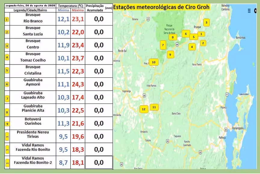 A semana dos brusquenses começou com temperaturas não tão baixas como nos últimos dias. O amanhecer desta segunda-feira, 24, registrou mínimas entre 10 e 12ºC. Aquecimento também observado nos picos máximos à tarde, quando finalmente, os termômetros voltaram a marcar índices acima dos 20ºC em Brusque, depois de uma sequência de 6 dias na presença de muito frio no município. Acompanhe abaixo os valores extremos apontados pelos termômetros das estações de monitoramento, instaladas na região do Vale do Itajaí-Mirim: