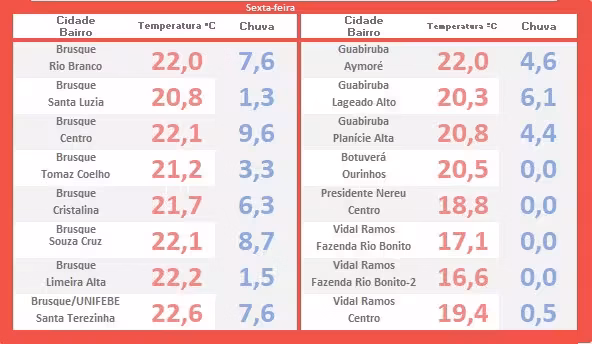 A tabela exposta abaixo mostra o levantamento das temperaturas mínimas pontuadas logo após o romper da aurora, correspondentes a cada local descrito em anexo (em vermelho). Confira também os volumes de chuva assinalados até o amanhecer (em azul):
