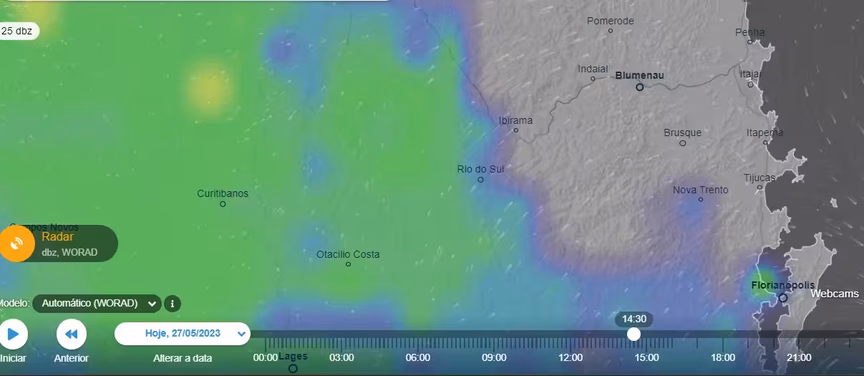 A imagem do Ventuski Radar, atualizada às 14h30, mostrava a ocorrência de chuva, que já estava afetando algumas cidades do Vale do Itajaí. A presença dessa umidade pode ser visualizada nas manchas coloridas do mapa apresentado abaixo.